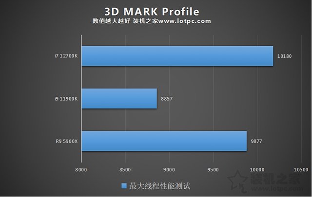 CPU Profile是3D MARK最新推出的CPU性能測試項目,相比CINEBENCH,它能夠更精準的測試出CPU線程數的性能表現,CPU Profile最大線程性能測試,i7 12700K跑了10180分,得益于混合架構,intel多線程也強了不少。