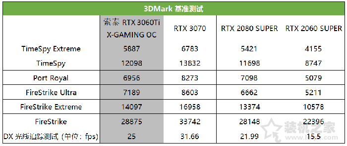 在基準測試中,RTX 3060 Ti的成績相對RTX 2080 SUPER大約有3%~14%的優勢,在光追測試中,優勢最高可達14%。相對RTX 2060 SUPER來說,優勢就十分巨大了,光追測試優勢高達61%,這個升級幅度應該能讓性能級玩家非常滿意了。此外,和RTX 3070相比的話,性能差距也非常符合核心規模的差距,可見NVIDIA的刀法確實很精準,由此也體現出了RTX 3060 Ti的高性價比。