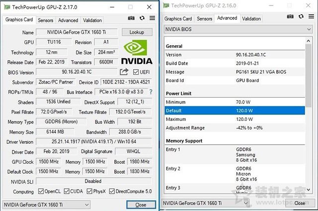 從GPU-Z截圖來看,GTX1660Ti X-GAMING OC擁有1536個流處理器,基礎頻率1500MHz,Boost頻率1830MHz,較公版要高出60MHz,192Bit 6GB GDDR6顯存,現存帶寬288GB/s,TDP為120W。