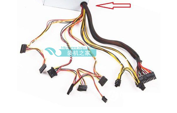 通常大家見到的普通電源都是非模組電源,能夠看到供電線直接從電源內部引出,非模組電源的輸出線材是固定輸出的如下圖所示。