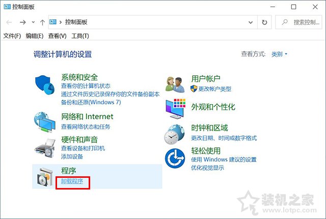 如果桌面沒有控制面板,可以在鍵盤上按下Win+R組合鍵,調(diào)出運行,在運行中輸入“control”并確定,就可以直接進入到控制面板了,或者在開始菜單旁邊的小娜搜索功能搜索“控制面板”。我們打開控制面板,點擊“卸載程序”。