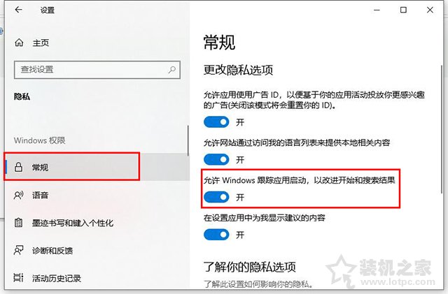 在常規的選項中,我們找到“允許Windows跟蹤應用啟動,以改進開始和搜索結果”的項目,將其開啟即可,這時候運行里就會保存歷史命令。