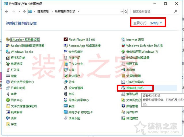 在控制面板中,我們將查看方式修改為“小圖標”,如下圖所示。