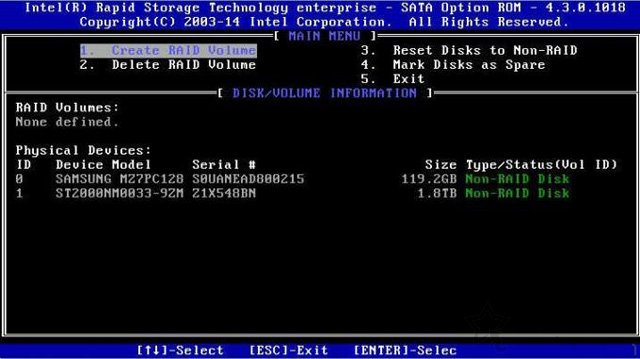 5、選擇1.create RAID Volume可以創建RAID磁盤陣列,如下圖所示。