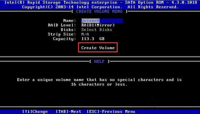 6、name是命名,可以默認,將RAID LEVEL選項,比方說我們組建RAID1就將選項選擇RAID1,如果要組建RAID0,就選擇RAID0,最后選擇Create Volume,即可創建磁盤陣列。