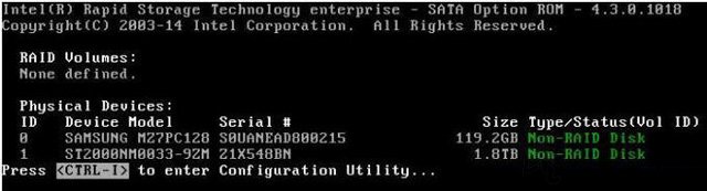 4、一般接兩個硬盤就進入如下界面,我們按“CTRL+I”組合鍵,即可進入“RAID”設置界面。
