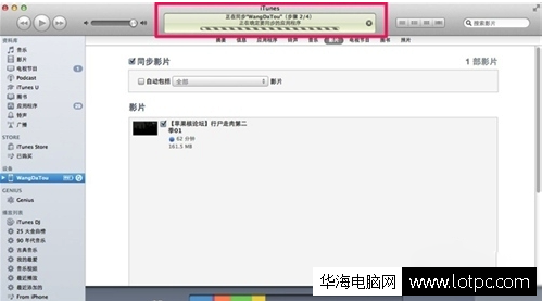 頂部狀態欄顯示正在同步影片到你的蘋果設備中。