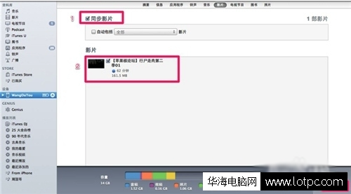 然后點擊左側欄列表您的設備,勾選“同步影片”再勾選剛導入的電影,點擊“應用”即可。