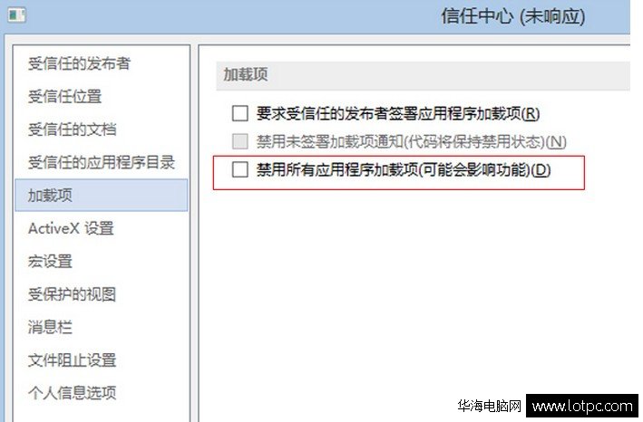 上述故障基本上可以確定為是由用戶所使用的加載項、ActiveX控件、宏或者設置所導致的。如果懷疑是加載項、ActiveX控件、宏引起的故障,那么我們可以在各Office應用程序中單擊功能區的“文件”選項卡,選擇“選項”,在選項設置對話框左側導航欄中單擊“信任中心”,再單擊右側的“信任中心設置”,在左側導航欄中選擇“加載項”,并選中右側窗口中的“禁用所有應用程序加載項(可能會影響功能)”,選擇左側的“ActiveX設置”,選中右側窗口中的“禁用所有控件,并且不通知”,再選擇左側的“宏”,選中右側的“禁用宏,并且不通知”,確認關閉所以對話框,關閉Office應用程序并重新打開測試故障是否被排除。如果多次重新啟動后確認故障已經被排除,則可以重新進入信任中心進行設置,逐一打開此前禁止的功能,觀察故障何時會再次出現以排查罪魁禍首。
