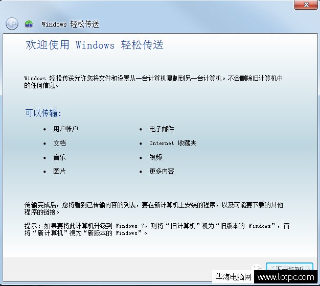 首先,我們分別在新舊兩臺電腦里搜索到“Windows輕松傳送”,找到之后,都點擊運行這個程序,看到一個提示可傳送內容的界面: