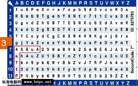密碼卡的工作原理類似于密碼,但它在提供足夠安全密碼的同時,用戶不需要記憶整個密碼,只需要記住自己在密碼卡取密碼的習慣或者規律即可。例如在如圖所示的密碼卡中,我們通過一個簡單的圖案取密碼,這樣就可以獲得一個高強度的9位數密碼“Au8S4s7tP”,然后我們通過類似“7E 11A”的坐標即可查找到該密碼。我們可以根據自己的喜好制作密碼卡,然后將它打印出來使用。