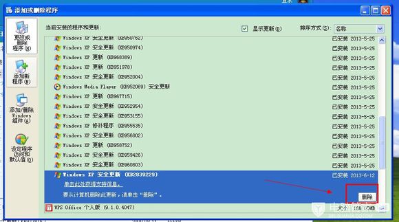 3:打開添加或刪除程序勾上“顯示更新”找到這兩個補丁點刪除然后重啟電腦即可恢復。