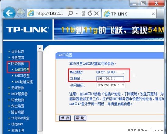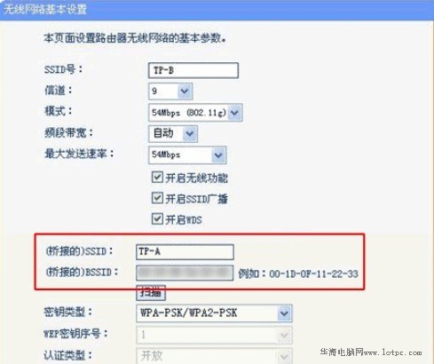 選擇左邊的“網絡參數”,選擇“LAN口設置”,要記錄右邊的IP和MAC地址。再單擊左邊的“無線參數”,選擇“基本設置”,在“SSID號”文本框中輸入“TP-A”,再將信道(也叫頻段)選擇為“9”:為保證網絡和橋接的穩定性,建議勾選“開啟SSID廣播”功能。
