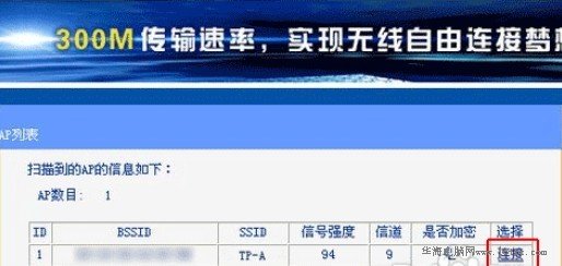 等一下會列出掃描到的無線SSID,在掃描到的無線SSID列表中單擊主路由器TP-A后面的“連接”按鈕。假如要沒有列表主路由器的信息,則表示沒有連接成功。