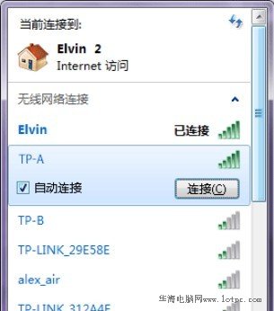 點擊剛剛建立的無線網絡“TP-A”,然后勾選“自動連接”,繼續單擊“連接”按鈕:從圖示中我們看出橋接的遠距離的TP-B信號很差。