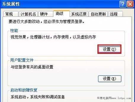 接著單擊“系統(tǒng)屬性”窗口里的“高級(jí)”欄目,再單擊性能旁邊的“設(shè)置”按鈕。