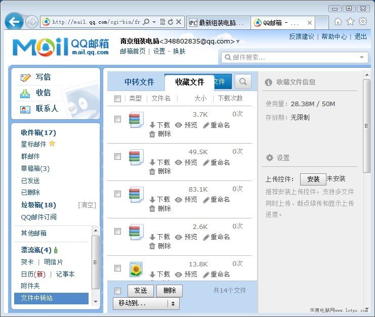 目前QQ郵箱中已經收藏了QQ網絡硬盤中的文件,我們可以通過訪問QQ郵箱即可快速實現網絡硬盤的文件上傳下載。我們首先打開QQ郵箱然后找到“文件中轉站”隨之點擊,然后切換到右側的“收藏的文件”,你就可以看到網絡硬盤中的所有文件都在這里。