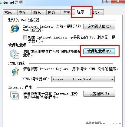 因此打開IE瀏覽器,選擇菜單欄的“工具”,選中“internet選項”,找到“程序”選項卡,里面有個“管理加載項”把上述3個類型的加載項,全部進行“禁用”操作。操作完,點擊確定,重啟瀏覽器。