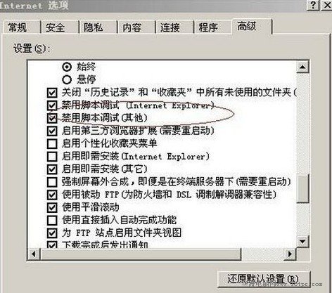 找到“高級”選項卡,找到“禁用腳本調試”選項,然后勾選后確定。最后重新啟動IE瀏覽器即可。