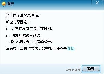 提示:“您當前無法登陸飛信。可能原因是:1、計算機沒有連接互聯網。2、網絡環境設置錯誤。3、防火墻限制了飛信的登錄。請您檢查后再次嘗試,如需幫助請點擊幫助。