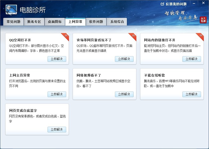 這個方法非常適合新手,考慮到很多客戶不懂技術方便,只能一些簡單軟件操作的客戶解決方法。首先大家百度搜索:QQ電腦管家,下載一個QQ電腦管家,點擊進入界面時,找到”電腦診所“的字樣,點擊進入→點擊上網異常→里面都是關于網頁修復頁面的,根據你的故障點擊即可。當時就是利用QQ電腦管家幫客戶遠程解決的。