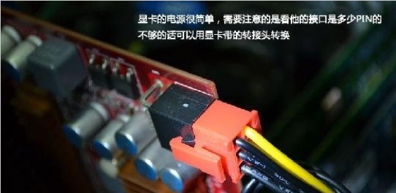 然后注意一下您的顯卡有沒有4PIN接口,一般低端的顯卡都沒有,可以忽略,如果有請看下圖:(注:顯卡有4PIN 6PIN 8PIN主要看你的顯卡),我們今天以4PIN的才做教程,都是一樣接法。