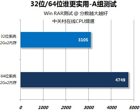 在WinRAR實(shí)際測(cè)試中,64位系統(tǒng)運(yùn)行雙通道4G內(nèi)存得分達(dá)到4749!相比32位雙通道系統(tǒng)得分高出53%。