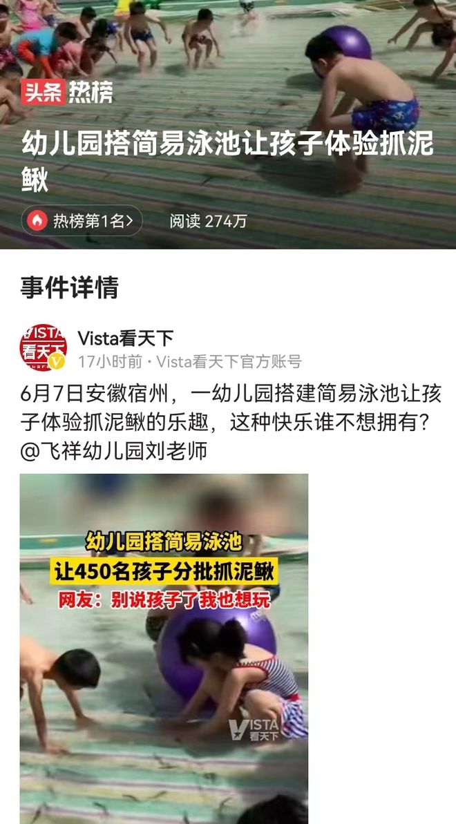 幼兒園搭簡易泳池讓娃體驗抓泥鰍:抓