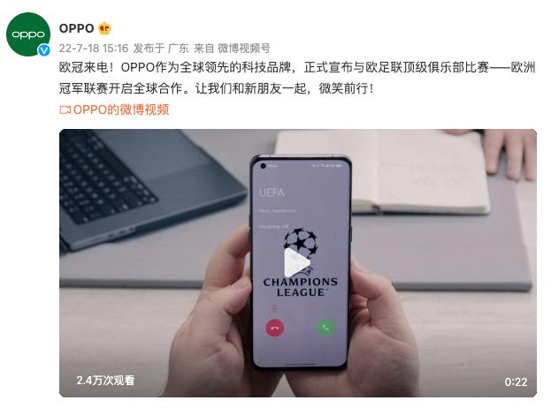 OPPO官宣:正式成為歐洲冠軍聯賽官方