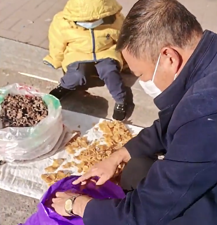 單親媽媽冷風中帶女兒路邊賣干菜