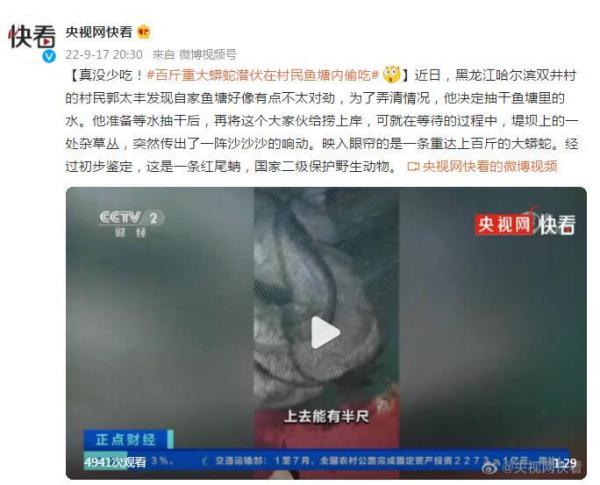 百斤大蟒蛇潛伏在村民魚塘內(nèi)偷吃