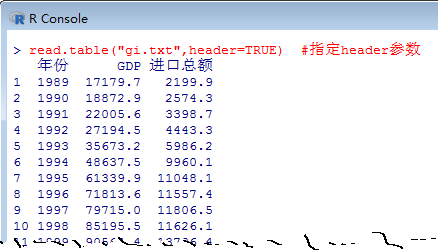 (2)read.table("gi.txt",header=TRUE) #指定header為TRUE,指明原文件中包含變量名(字段名)