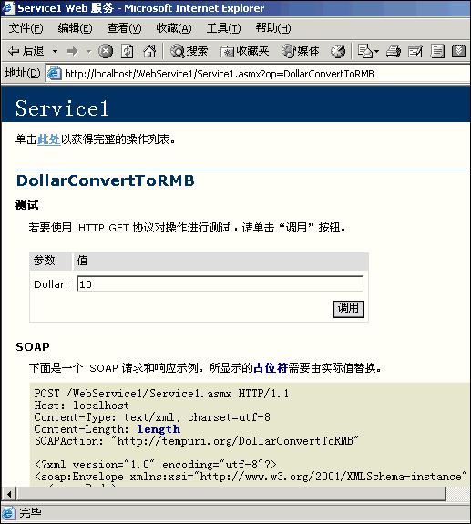 在這個(gè)例子中列出的方法沒(méi)什么特別之處,因?yàn)閮H有一個(gè)方法(DollarConvertToRMB)。鼠標(biāo)點(diǎn)擊這個(gè)方法會(huì)顯示另一個(gè)網(wǎng)頁(yè),如圖5所示。這一頁(yè)就是該特定方法的測(cè)試頁(yè),其中包括對(duì)應(yīng)方法接受的每個(gè)參數(shù)的文本框。現(xiàn)在請(qǐng)?jiān)谖谋究蛑休斎?ldquo;10”并按下“調(diào)用”按鈕。