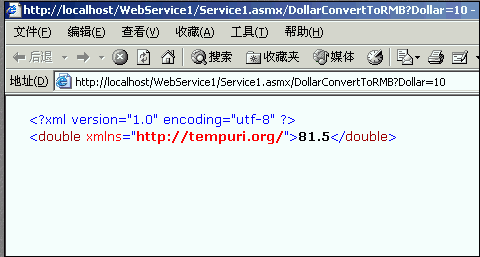 返回的結(jié)果是一些XML代碼,可能用戶界面顯得不那么友好,但是這些結(jié)果確實(shí)不一定非要采取對(duì)用戶友好的格式,因?yàn)槟阃ǔ2粫?huì)從瀏覽器直接調(diào)用Web服務(wù)。相反,你往往從應(yīng)用程序調(diào)用Web服務(wù)同時(shí)適當(dāng)?shù)靥幚矸祷氐腦ML代碼。不過(guò),也很容易從上面的代碼看出Web服務(wù)已經(jīng)把10美元轉(zhuǎn)換成了81.5人民幣了。