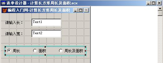 4、在label控件及文本框控件的下方添加一個選項按鈕組控件Optiongroup1,首先將它的AutoSize屬性值設置為.t.,ButtonCount屬性值設置為3;然后右擊選項按鈕組控件選“編輯”ming令,在它的編輯狀態下拖動其中的三個選項按鈕成水平排列,并依次選中三個選項按鈕,將它們的caption屬性值依次設置為“周長”、“面積”和“周長及面積”,如下圖: