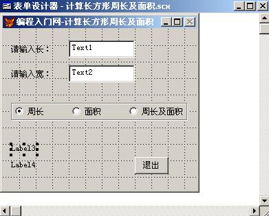 5、在選項按鈕組控件的下方添加兩個label控件:label3和label4,將它們的visible屬性值設置為.f.;在label控件的右側添加一個ming令按鈕控件command1,將它的caption屬性值設置為“退出”。適當調整各控件的大小和在表單上的位置,表單設計器如下圖所示: