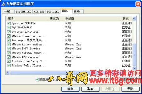 除了“啟動”項加載的程序外,一些程序為了加強自身的“健壯性”,會將自身注冊為系統的服務。同樣將不需要的服務取消即可,還是在“系統配置實用程序”中,切換到“服務”標簽,為了防止將一些系統服務禁用后造成系統的不正常,可以將“隱藏所有Microsoft服務”選項勾選,然后再根據服務的名稱判斷,去除不需要的服務(見圖2)。