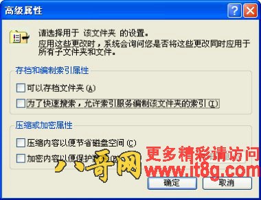 如果你不想更新系統補丁或者是因為其他情況不能更新補丁的話,可以打開“我的電腦”窗口,找到保存事頻文件的文件,右擊單擊該文件夾,在彈出的快捷菜單中選擇“屬性”,在打開的“屬性對話框中,在“常規”標簽下,單擊“高級”按鈕(見圖3),在打開的“高級屬性”對話框中,去除“為了快速搜索,允許索引服務編制該文件夾的索引”選項的選擇(見圖4)。
