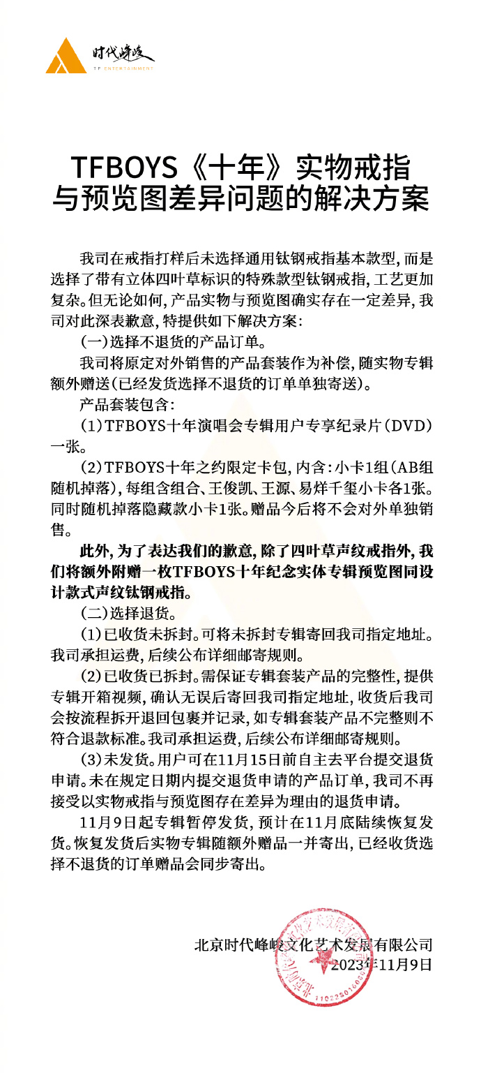 時(shí)代峰峻回應(yīng)TFBOYS十周年戒指事件