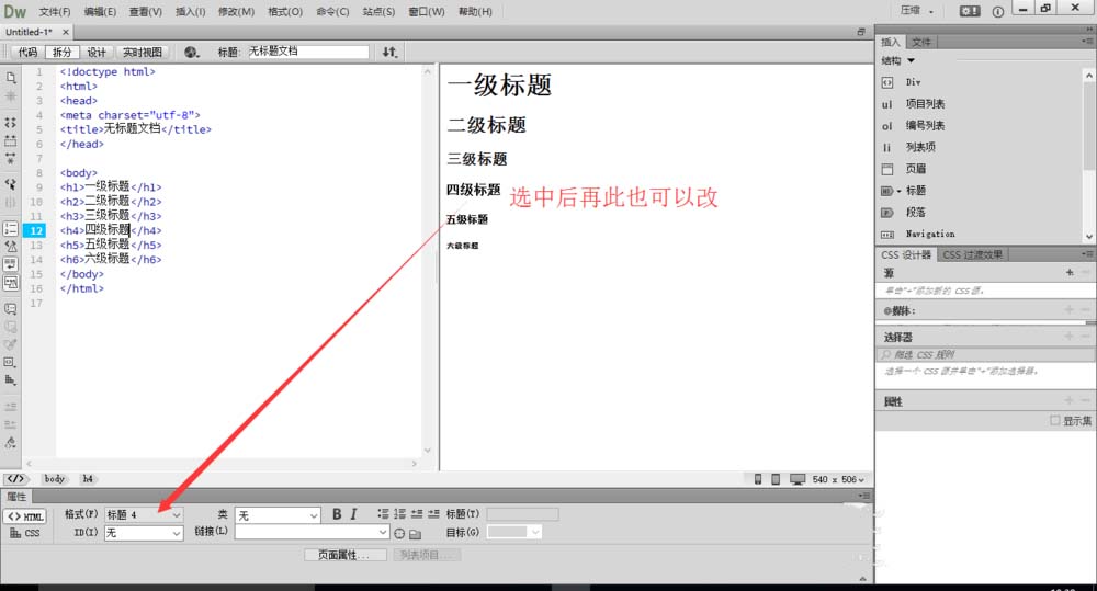 2、或者在最下方的“屬性”面板中,選擇格式下拉框里的“標(biāo)題1”。