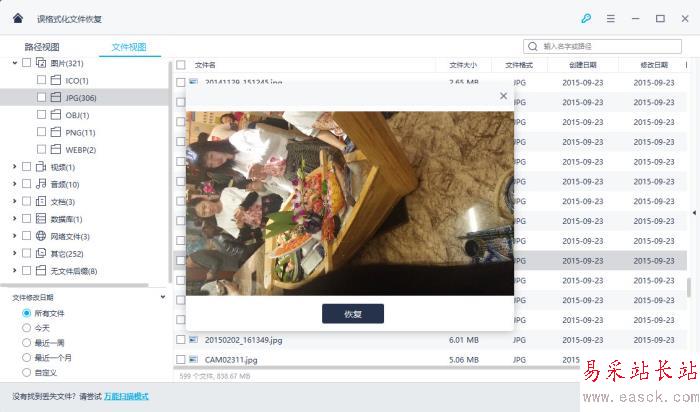 掃描過后,會有成堆的文件展示在你眼前。當然,不會讓你一份份打開、查看并恢復的,這多費事啊。你可以根據路徑視圖或文件視圖進行篩選和預覽,再點擊“恢復”按鈕,復原相中的文件。