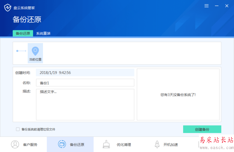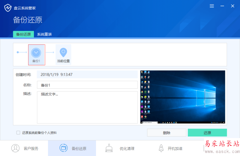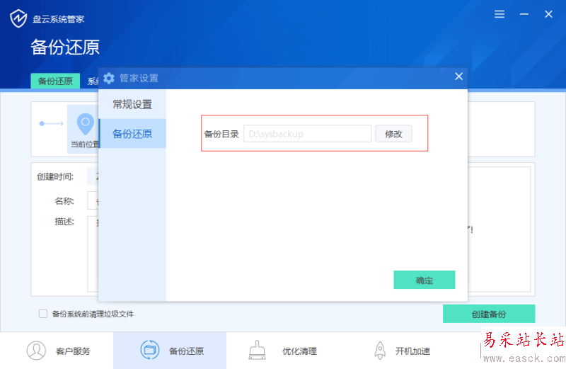 備份還原:點擊創建備份并選擇需要備份的盤,開始備份即可。