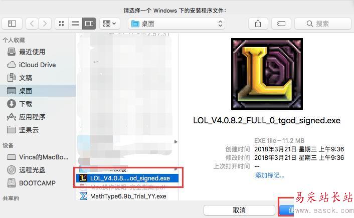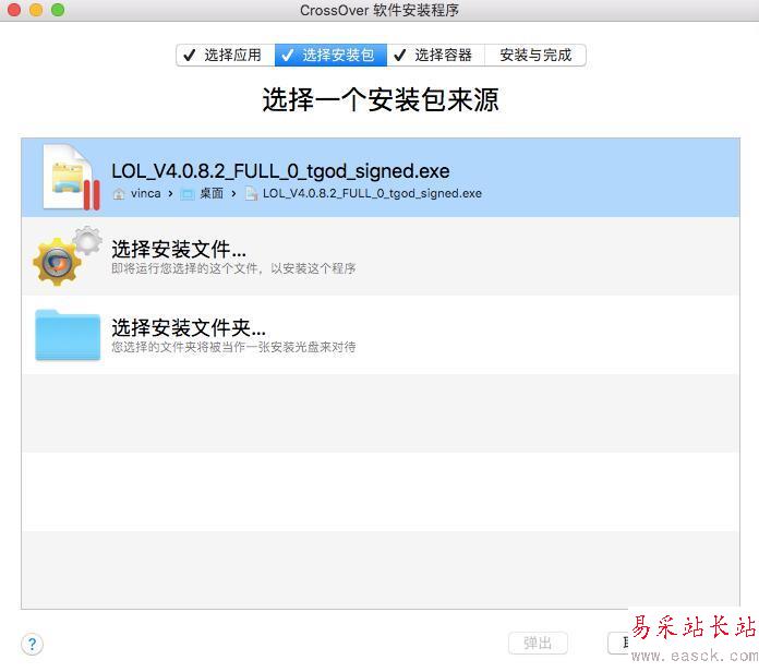 3、在選擇一個安裝包來源中選擇“選擇安裝文件”,在出現(xiàn)的小窗口中選中之前下載好的英雄聯(lián)盟安裝包,然后點擊“使用這個安裝程序”;