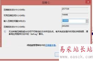 在打開的壓縮卷窗口中,在“輸入壓縮空間量”處輸入合適的數(shù)值(一般1G就夠了),如下圖所示: