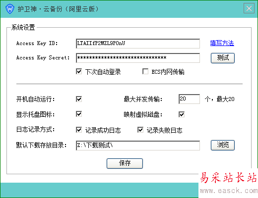 在系統(tǒng)設(shè)置中,可以設(shè)置Access Key ID 和 Access Key Secret,以及是否顯示托盤、最大并發(fā)傳輸數(shù)等。