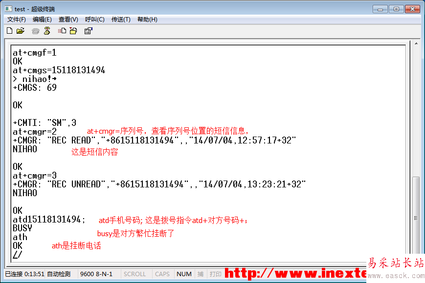 發短信,輸入AT+CMGS=15118131494按回車(15118131494 為手機號) 按提示在〉后輸入內容后按Ctrl+Z發信息