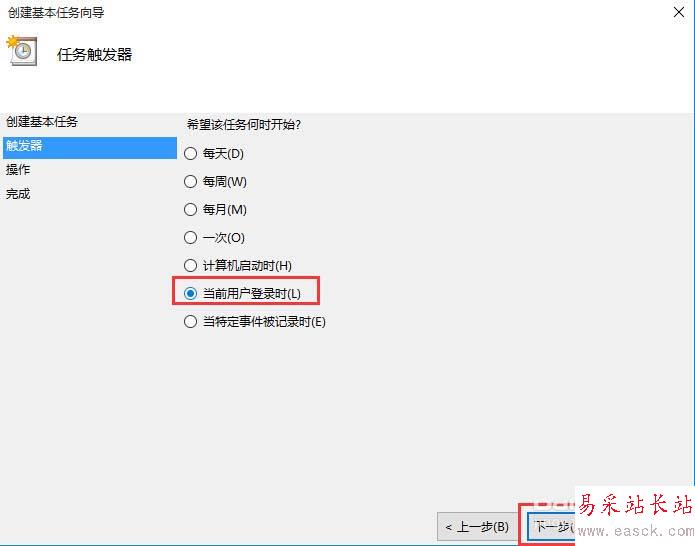 4、進入“觸發(fā)器”一欄中,選擇“當前用戶登錄時(L)”,然后點擊“下一步”。