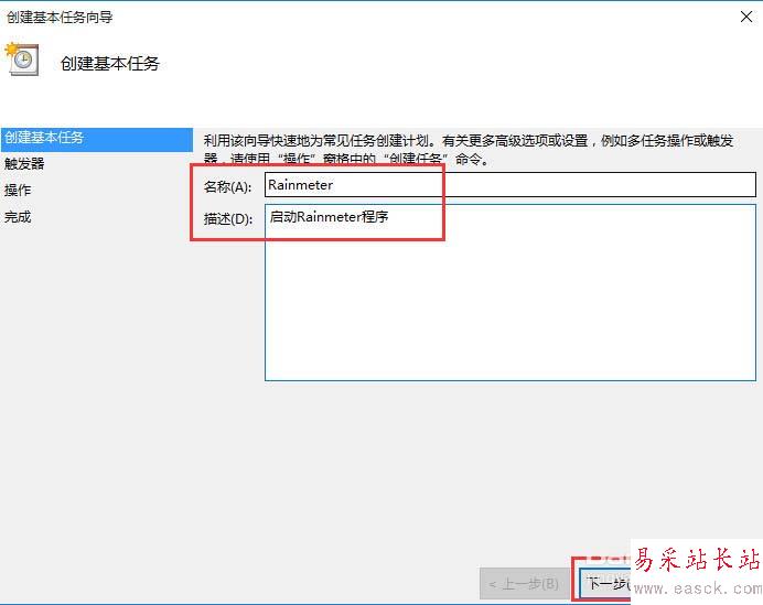 3、進入到“創(chuàng)建基本任務向?qū)?rdquo;界面,首先在“創(chuàng)建基本任務“一欄中填寫名稱(A)及描述(D),名稱、描述分別輸入任務的名稱和對任務的描述,在這里名稱我寫為Rainmeter,然后點擊“下一步”。