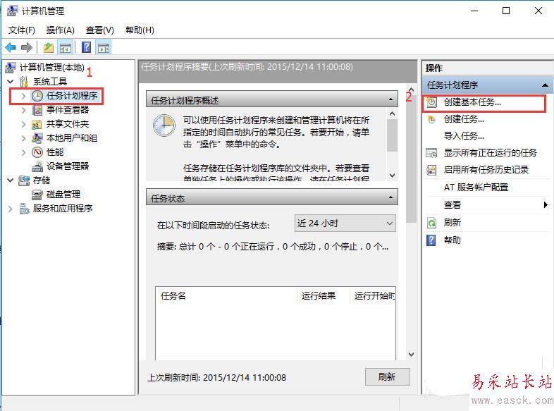2、進入到“計算機管理”界面,點擊左側的“系統(tǒng)工具”→“任務計劃程序”,點擊右側“任務計劃程序”下的“創(chuàng)建基本任務...”,如下圖所示。