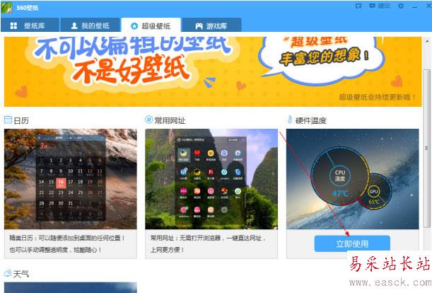 1、打開360壁紙電腦版主界面,點擊“超級壁紙”,在頁面中有一個“硬件溫度”的選項